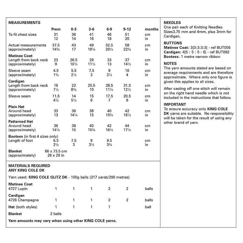Matinee Coat, Cardigan, Hats, Bootees and Blanket knitted in Glitz DK
